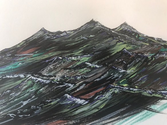 I decided I should just do a quick sketch which I’d try and pull from my murky, defunct artistic brain, and started to sketch out a wee mountain range. That was always a go to thing I would draw. I love landscape, I love its emotion, its colour, it’s terrifying grandeur, and also how it inspires musical ideas……